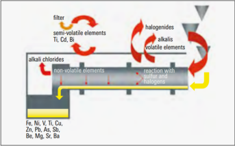 使用替代燃料會導(dǎo)致窯內(nèi)氣氛中揮發(fā)性成分的富集且循環(huán)加?。▓D 1)。