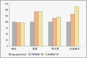 產(chǎn)品名稱“AF”(替代燃料)是指鎂尖晶石磚,它是根據(jù)一種新開發(fā)的概念制造的,可以大大提高抗化學(xué)侵蝕性能。與其他傳統(tǒng)堿性磚相比,由于使用了改性電熔尖晶石,它們對水泥熟料相的滲透和侵蝕具有更強的抵抗能力,這是另一個優(yōu)勢。磚的性能如圖4所示。
